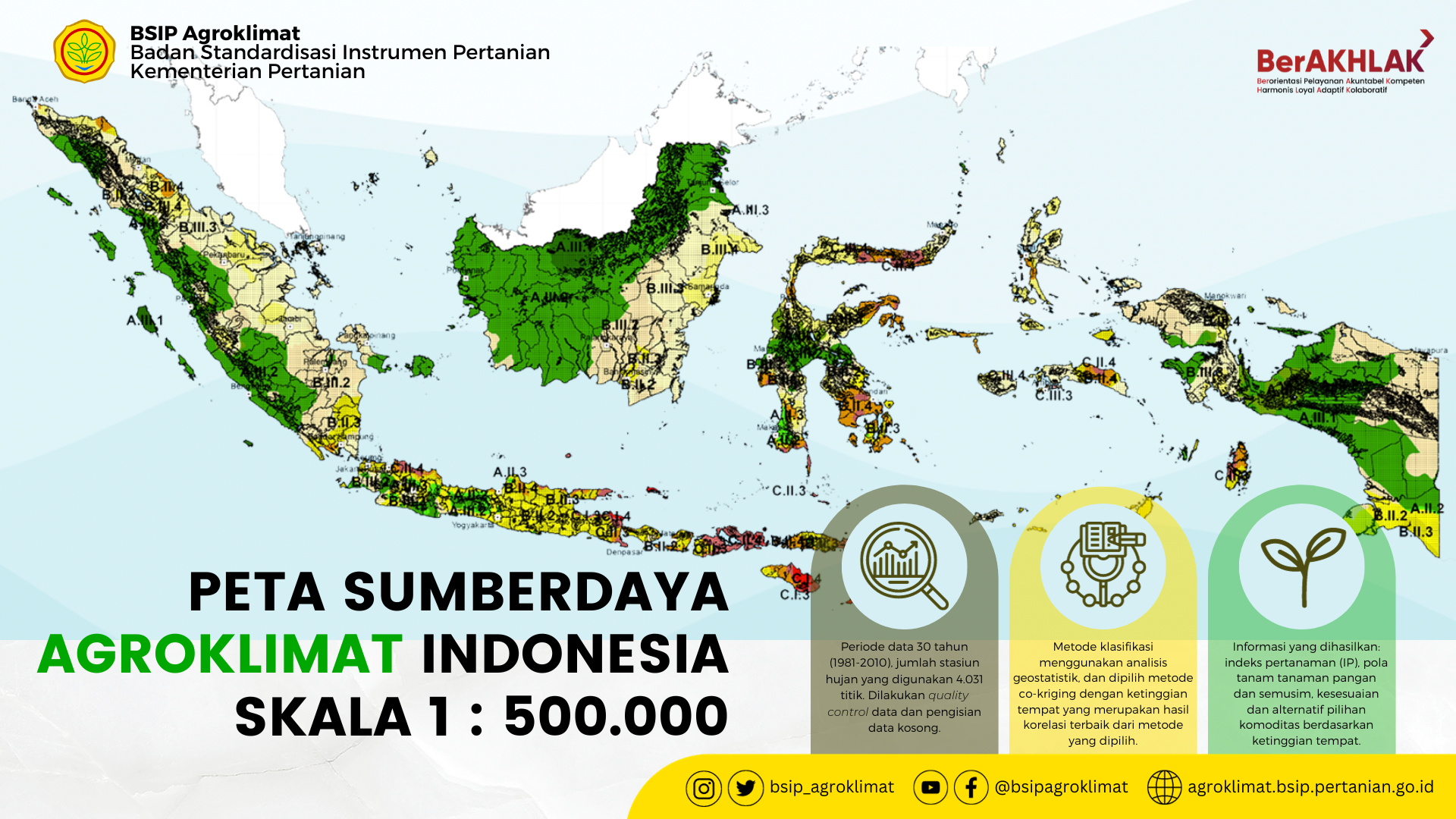 Peta Sumberdaya Agroklimat memberi informasi potensi sumberdaya agroklimat berdasarkan data iklim selama 30 tahun, untuk mendukung perencanaan pertanian. Peta ini mendukung pemilihan komoditas dan proses pemetaan kesesuaian lahan.