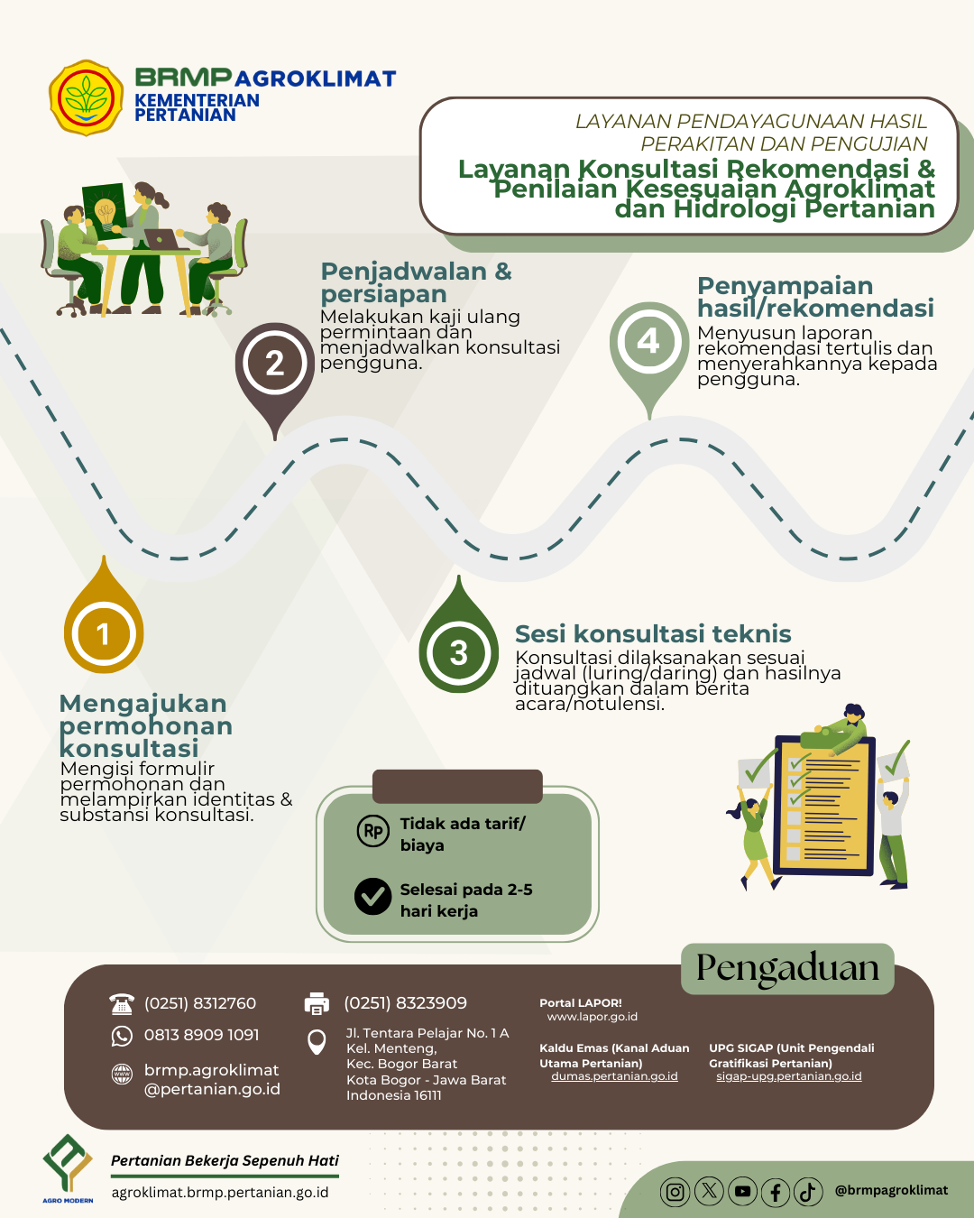 Permohonan Konsultasi Rekomendasi dan Penilaian Kesesuaian Agroklimat dan Hidrologi Pertanian dapat menghubungi Whatsapp Center BRMP Agroklimat di 0813-8909-1091 atau datang langsung ke Kantor BRMP Agroklimat dan Hidrologi Pertanian, dan kemudian mengisi form layanan berikut :